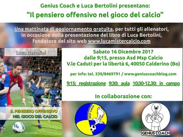 Luca Bertolini, fondatore di lucamistercalcio.com, un sito molto conosciuto e dedicato alla divulgazione di esercitazioni calcistiche, presenterà la versione italiana del suo libro “Il pensiero offensivo nel gioco del calcio”.