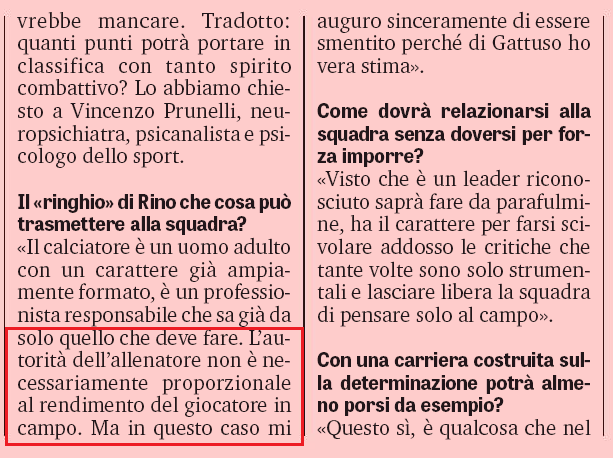 VINCENZO PRUNELLI, psicologo dello sport, GAZZETTA DELLO SPORT 29-11-2017